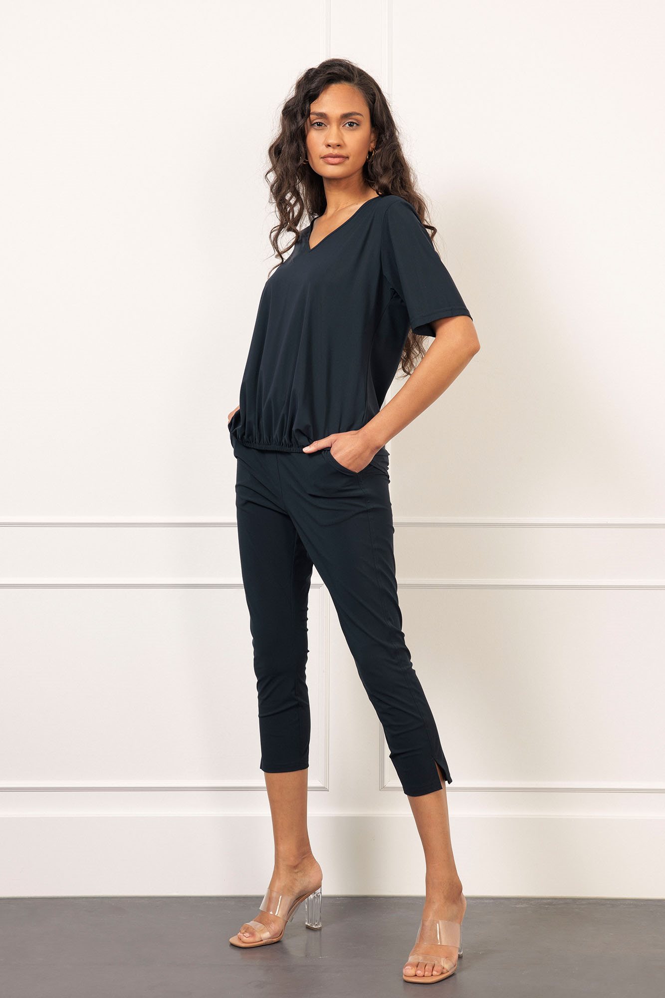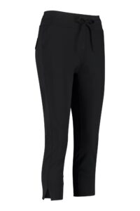 De zwarte Billy Trousers van Studio Anneloes is een capri/driekwartbroek met een aangesloten pasvorm en een binnenbeenlengte van 60 cm. De broek is gemaakt van Medium Travel Quality, wat zorgt voor een comfortabele pasvorm. Aan de voorkant van de broek zijn steekzakken te vinden en aan de achterkant imitatie klepzakken. De tailleband heeft een drawstring en aan de onderkant van de pijpen zit een splitje. De kleur van de broek is zwart.