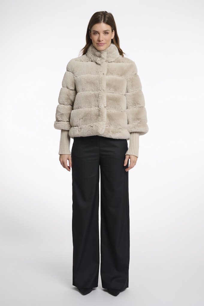 Materiaal Imitatiebont: 100% Polyester; PU: 100% Polyester; Coating: 100% Polyurethaan; gebreide mouwen: 40% Polyester, 20% Merinowol, 20% Polyamide, 20% Acryl; voering: 100% Polyester