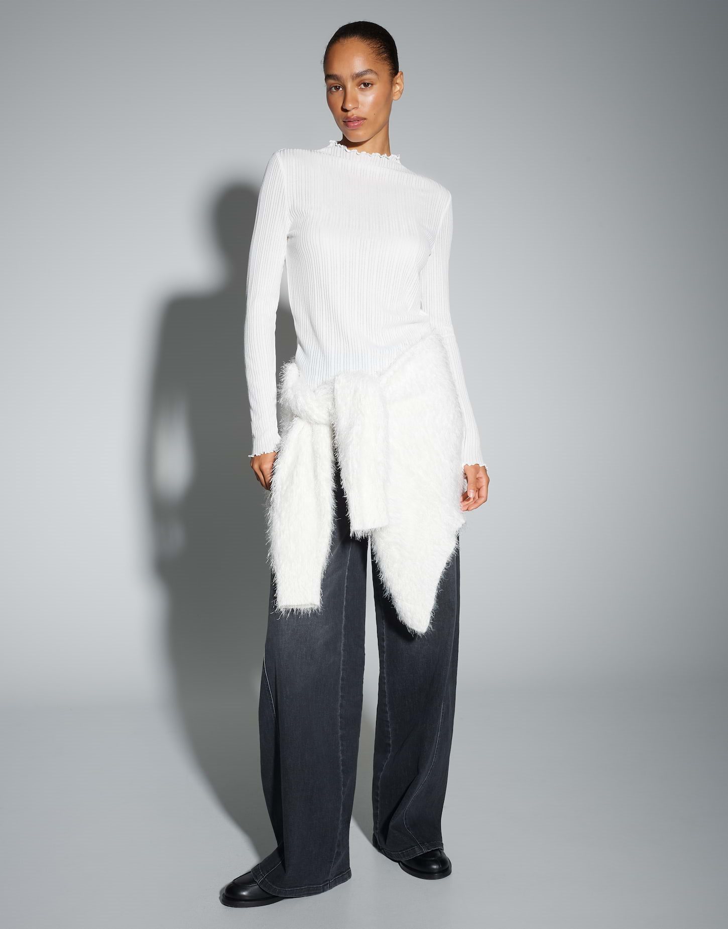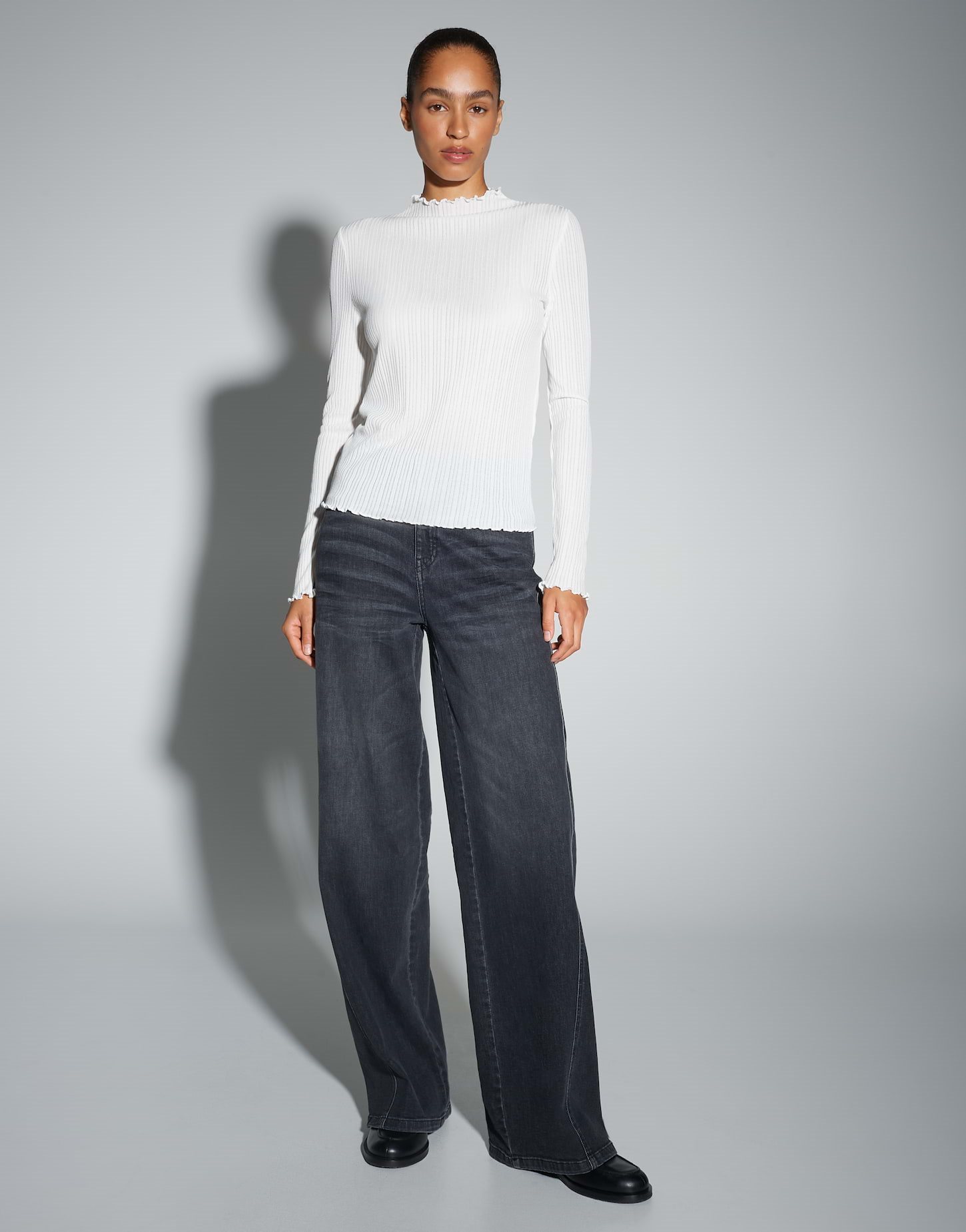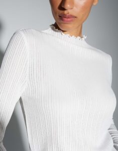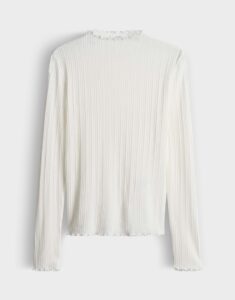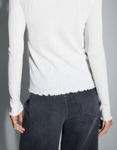 Het Shirt Shivi is een elegant en veelzijdig item dat zich moeiteloos laat stylen, van casual tot chic. Het licht doorschijnende, geribde materiaal en de subtiel gekartelde randen geven dit shirt een verfijnde uitstraling. Dankzij de slanke pasvorm en opstaande kraag is het perfect te dragen als basislaag onder een blazer, vest of trui.