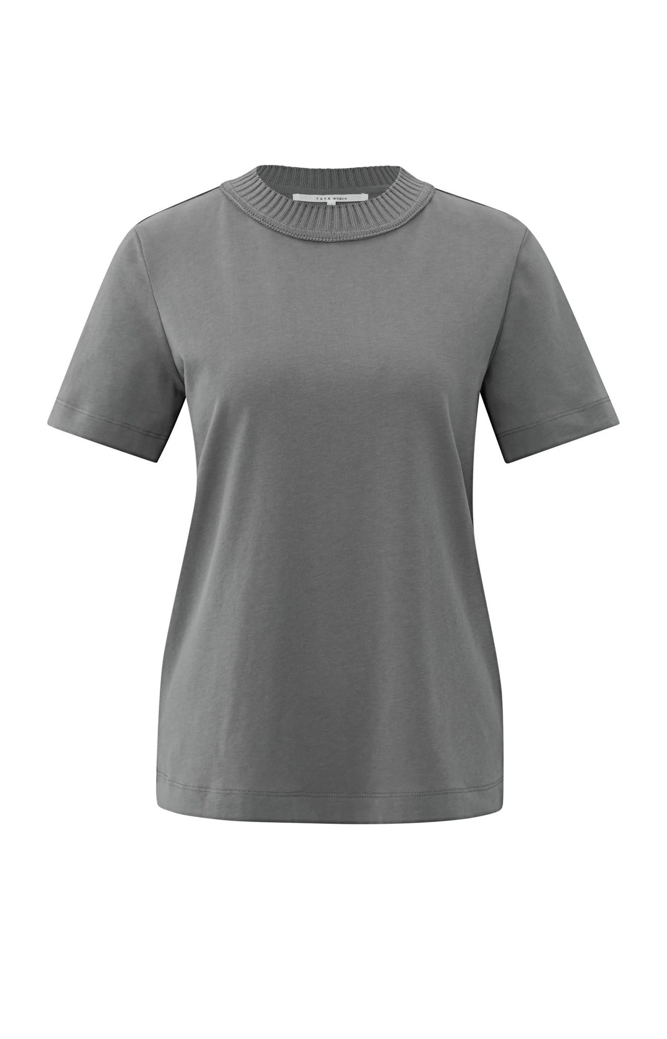 Een stijlvol T-shirt met korte mouwen, een rechte pasvorm en een ronde halslijn die is afgewerkt met een fijngebreide boord. Gemaakt van een zachte katoenmix die comfortabel aanvoelt en makkelijk te combineren is. De subtiele structuur in de halslijn voegt een speels detail toe aan deze tijdloze basic. Het model is 173 cm en draagt maat S.