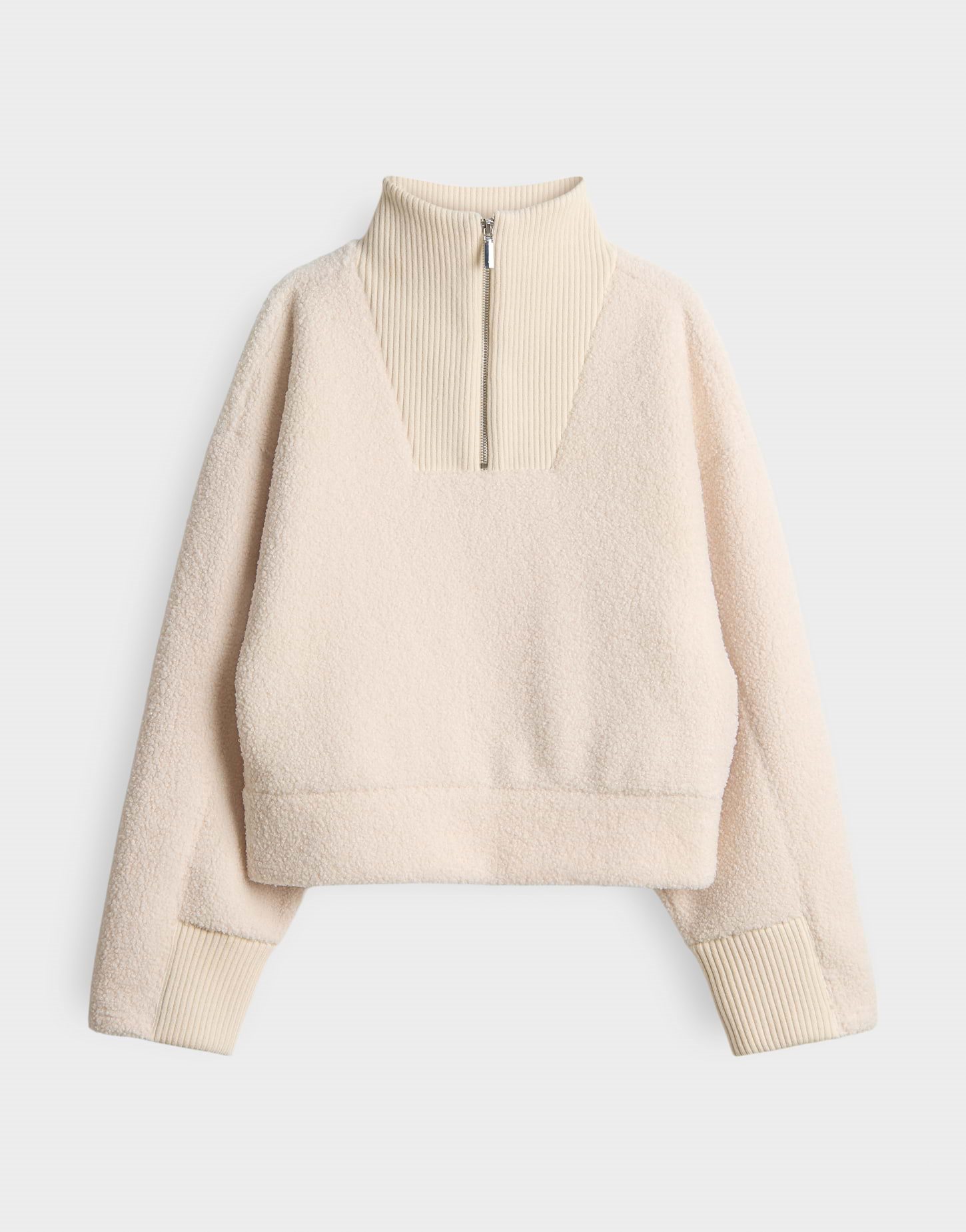 Het Teddy Sweatshirt Gick is de perfecte mix van sportief en stijlvol. Gemaakt van zacht teddybont voelt het heerlijk warm en comfortabel aan, terwijl de troyer kraag met korte rits zorgt voor een moderne, casual look. De losse pasvorm met smal toelopende snit en gedropte schouders geeft het sweatshirt een relaxed silhouet dat moeiteloos te combineren is. Draag het met jeans voor een stoere everyday look of met een wide leg broek voor een stijlvolle twist. De ruglengte is circa 56 cm in maat 36. Kleur zacht crème: het model is 176 cm lang en draagt maat 36.