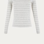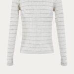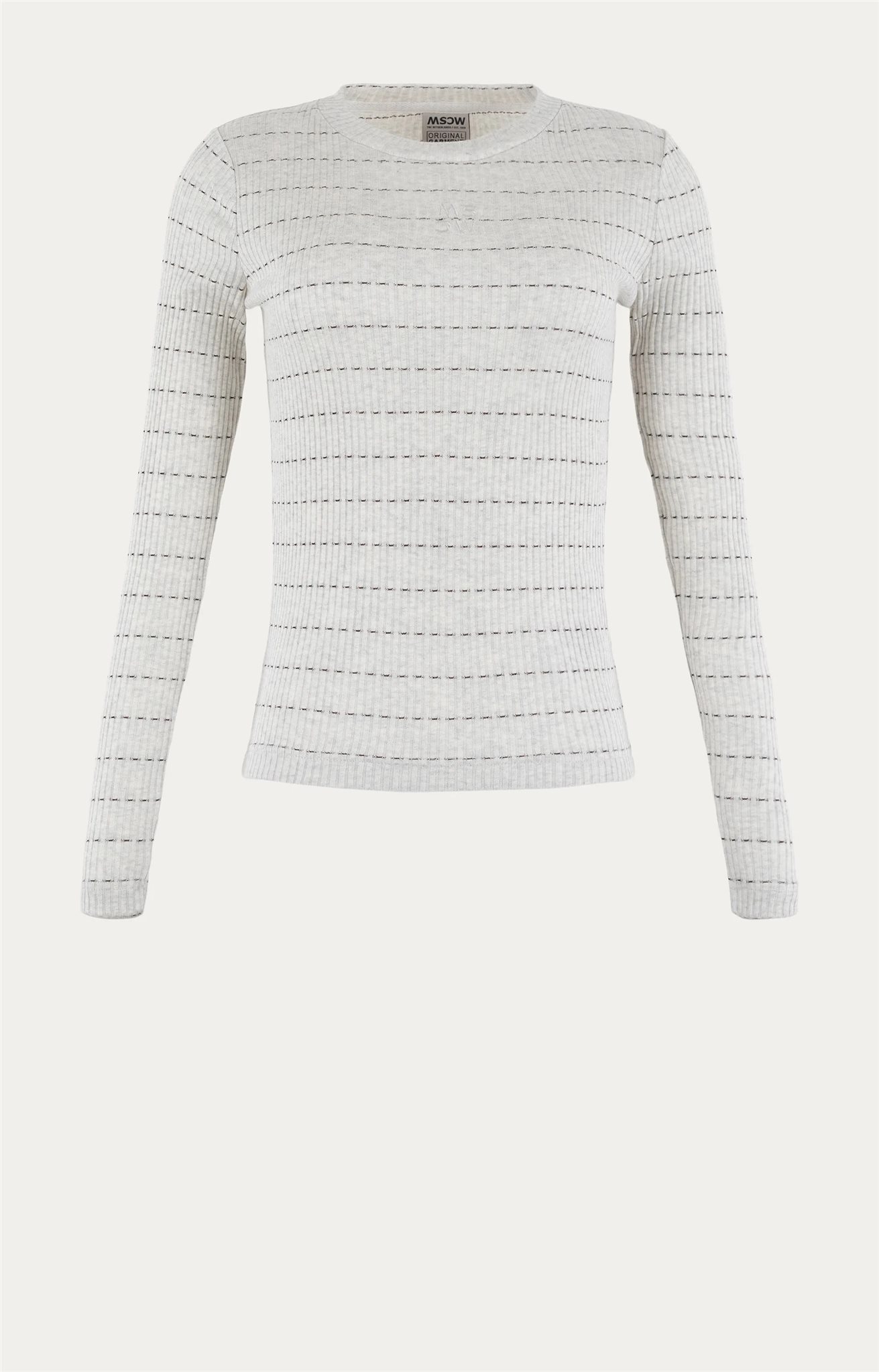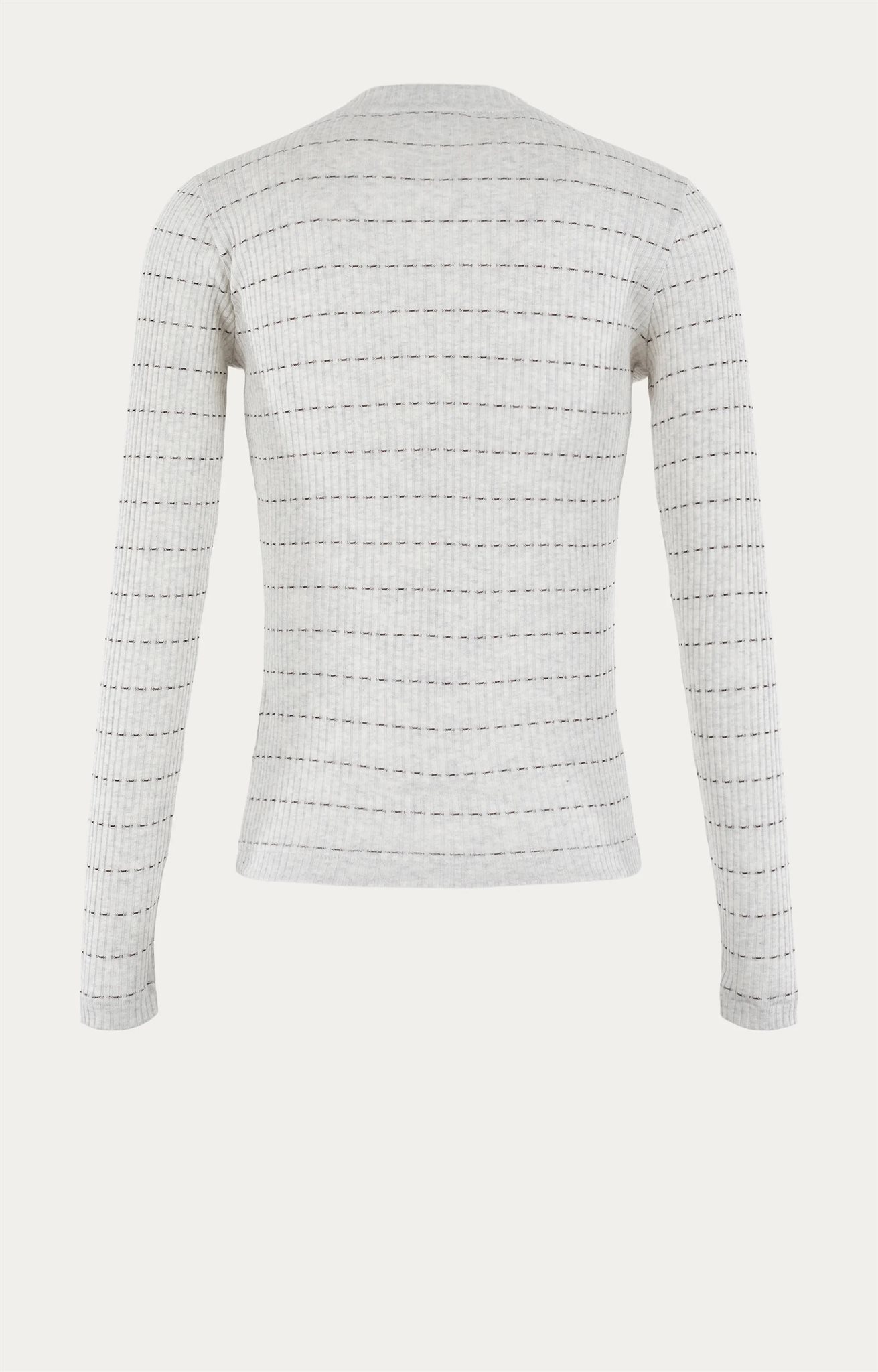 Deze longsleeve van Moscow is een comfortabele winterbasic met een moderne touch. Het model is uitgevoerd in een zachte ribstof van viscose en elastaan en heeft een aangesloten pasvorm. De ronde hals en het subtiele streepdesign in light grey melange stripe geven de top een eigentijdse uitstraling, terwijl het ton-sur-ton detail op de borst voor verfijning zorgt. Perfect om solo te dragen of als extra laag onder een vest of trui.
